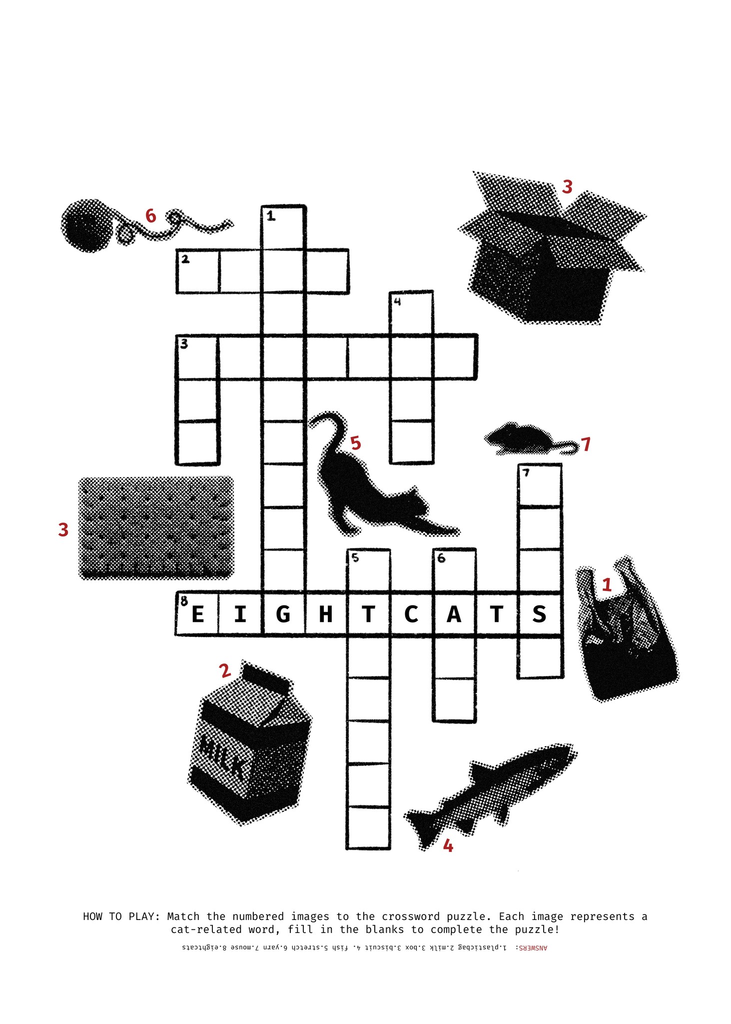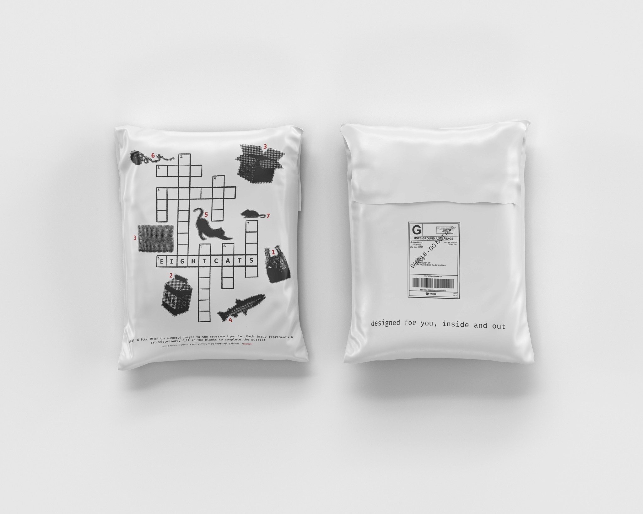 A sustainable reimagining of Eight Cats’ polymailer packaging, designed to be kept rather than discarded. This playful, interactive crossword turns each mailer into a small art piece, giving it a second life in the hands of customers.