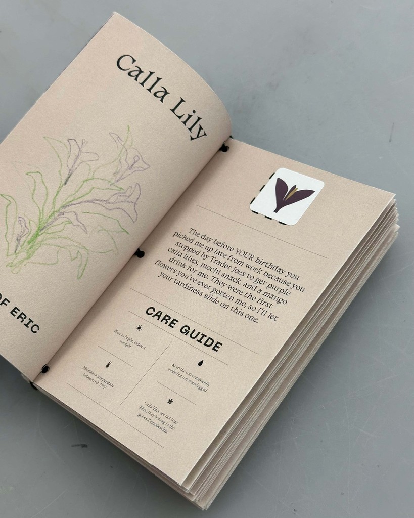 “the victorian secret flower language, a coded way of communicating sentiments and emotions using specific flowers” 3” x 5”, french folds, japanese stab bind + stickers. Created as a one-year anniversary gift, it celebrates the flowers exchanged between my partner and me.